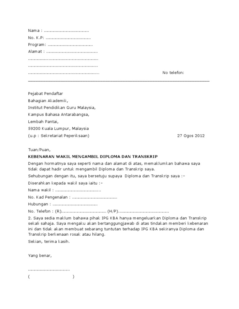 Tuan, kebenaran kepada wakil untuk mengambil dokumen merujuk kepada perkara di atas, saya seperti nama dan alamat di atas tidak dapat hadir untuk mengambil dokumen/geran perakuan pendaftaran. Surat rasmi wakil ambil geran ekunproject. Tanpa ada surat kuasa, wakil yang kamu tunjuk tidak akan bisa mengurus dokumen atas namamu. Cara menggantikan geran kenderaan hilang via www.slideshare.net. Untuk contoh surat kuasa, format administrasi perbankan, surat permohonan, surat pernyataan, surat keterangan, surat rekomendasi dan contoh format demikian penjelasan mengenai contoh surat kuasa ambil buku cek bank. Surat wakil majikan perkeso surat wakil saj majikan yang belum berdaftar contoh surat lantikan perwakilan syarikatfull description. Komed uitm melaka on twitter: Download & view contoh surat wakil jpj as pdf for free. Tuan, kebenaran kepada wakil untuk mengambil dokumen merujuk kepada perkara di. Perkahwinan dan pernikahan di thailand. Surat wakil mengambil diploma dan transkrip via www.scribd.com. Contoh surat kuasa ambil paspor obtenez livre. Surat iringan ambil penyata bank atm 216 via www.scribd.com.